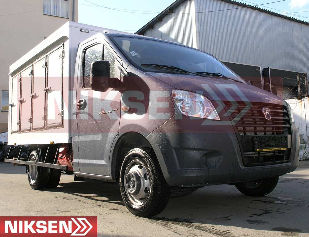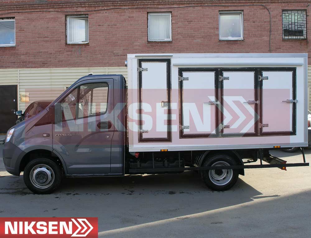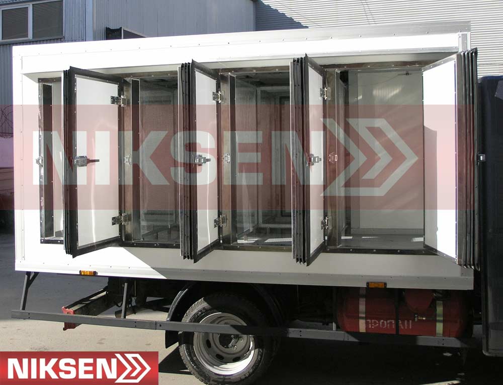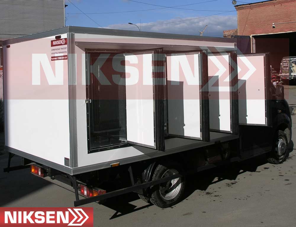 Для удобства перевозки замороженной продукции в специальных тележках, а также погрузочно-разгрузочных работ, изотермический кузов изготавливается не только с боковыми, но и дополнительными задними распашными дверями с усиленным порталом, а также устанавливаются специальные рельсы для тележек.